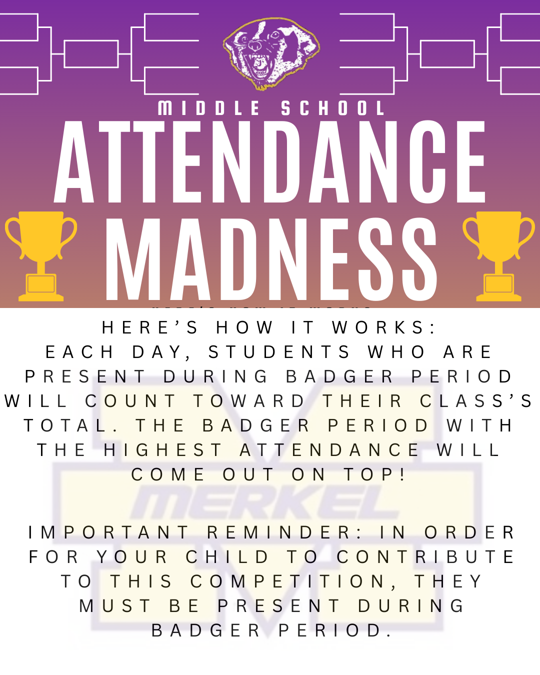 Merkel Middle School cheerleading squad poses with Badger mascot in a gymnasium.